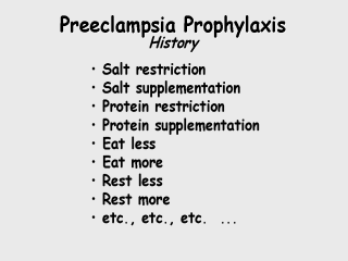 | There's a long history of prophylaxis in preeclampsia. A lot of it is dietary, and you see it summarized here fairly extensively. Some people recommend restricting some things, some people recommend adding some things. Some people recommend restricting and adding the same thing. The bottom line is there was never anything that successfully prevented preeclampsia, as rational as therapy may have seemed based on the hypothesis that guided the treatment. |
