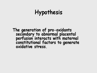 the Part II of this lecture? We wondered if the setting in preeclampsia might be similar and that linkage between those two stages of preeclampsia could in fact be oxidative stress, and if you had abnormal placental perfusion, the generation of pro-oxidants in that setting would interact with the maternal constitution to generate oxidative stress. This was the idea of linking those two balls. |