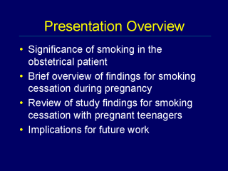 | During the course of this presentation, we will provide an overview of the significance of smoking as a problem with obstetrical patient, intervention research findings for the adult and a the adolescent study funded by the NINR and conducted here in Pittsburgh, and close with implications for future work. |