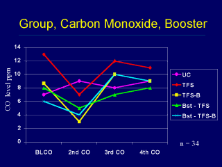 to the carbon monoxide levels at the 4 data time points. Only the TFS with Booster managed to have a mean CO less than 8 across the four sampling times, but the sample size was small for this analysis, particularly since a small number of subjects participated with the booster sessions. |