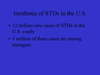 | Looking at the U.S., there are 12 million of new STD cases a year, and actually teenagers are the highest risk group. So if you take a group of sexually active individuals, you will find that the absolute youngest are at the highest risk for developing STDs. I remember when I saw for the first time that it was 14-19 year old girls that had sky-high rates of STDs - Gonorrhea and Chlamydia - if they’re sexually active, as compared with any other group, it was pretty distressing. |
