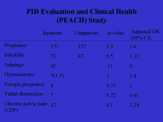 What’s the bottom line to the PEACH study? These data are being published in May 2001 in what’s called the “Grey Journal,” The American Journal of Obstetrics and Gynecology. You can look down all these adjusted odds ratios but the bottom line is nothing is going on. There is no difference between inpatient and outpatient treatment at all. No matter what we looked at – pregnancy, infertility, peak episodes of PID.
