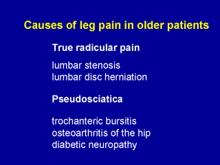 | Lumbar stenosis which is narrowing of the vertebral canal or disc herniation in which the disc protrudes into the spinal canal. There are many other conditions which sort of mimic that and the physician will then rule out those other conditions. |