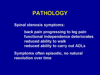 | What happens when you have spinal stenosis: back pain progresses to leg pain, functional dependence deteriorates, reduced ability to walk, reduced ability to carry out ADLs. And the person becomes very, very disabled if this is not surgically corrected. Symptoms are often episodic with no natural resolution. |