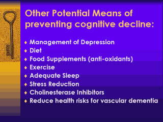 Food supplements, I’m not sure if they’re important or not but certainly there’s a lot of discussion and literature talking about the use of antioxidants as a way to minimize cognitive decline in aging. Exercise. I’ll let the experts speak for themselves. Exercise is critical to healthy aging in general. Adequate sleep. Something that I often preach to individuals that I meet with to look at carefully as a basic tool for making sure that people are making the best use of their cognitive abilities. Stress reduction has long been a tool we’ve used in psychology and in mental and behavior health to assist people in making the best use of what they’ve got. Cholinesterase inhibitors, Aricept, Exelon and medications like that. They have got a lot of use and a lot of attention in recent years and in general reducing health risks for vascular dementia.