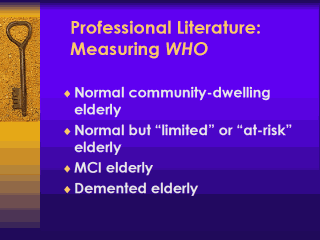 | Who are we going to study? Again I thought and as I started to look around it seemed to be all over the place. We have normal community-dwelling elderly are the participates in some studies. We can look at normal elderly but who are described as “at-risk”. Elderly who are often diagnosed when mild cognizant impairment may be participates in the studies or the demented elderly. |