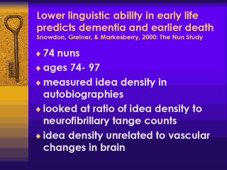 Again, from The Nun Study, some general sense of what might change or not. Lower linguistic ability in early life predicts dementia and earlier death. Again, even a smaller set of cohorts, 74 nuns ages 74-97. And again they used the same autobiographies written at 30-60, a long time ago, to measure idea density and they looked at the ratio of the idea density to neurofibrillary tangle count. They found the idea of density related to the tangle counts but unrelated to any vascular changes that the individuals might have experienced before their death.