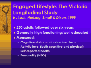 There are several longitudinal studies: one is The Victoria Longitudinal Study. They followed 250 adults over six years and generally had a population that was pretty high functioning and fairly well educated. They measured cognitive status on standard neuropsychological tests. They looked at activity levels and they separated that out to a cognitive activity level, mental tasks, and to physical activities such as hobbies and physical fitness. They looked at self-reported health and they looked at personality using the NEO.
