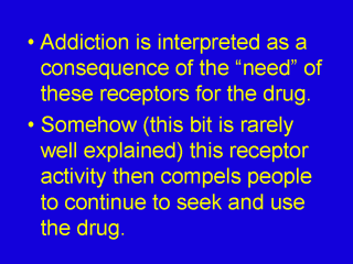However, there is a problem with this explanation. The pharmacological action of the drug does not explain why people’s behaviour changes in the long term. It is presumed that once exposed to high levels of the drug, receptor density or activity changes. To maintain the same level of neuronal activity, the person must maintain high concentrations of the drug in the brain. Without this, the user becomes depressed, suffers discomfort, and seeks the drug to restore “normal” level of neuronal activity and a tolerable subjective state of well being. Those who become “addicted” have genetically-determined receptor deficits that make them chemically stimulate themselves to medicate their “inadequate” receptor activity.