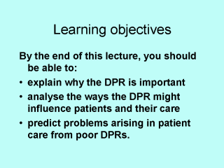 predicting problems that can arise in patient care from poor DPRs. While not every patient you see will require surgery, a MRI scan or even medication, every patient will experience the DPR. It is a foundation of good practice and like the foundation of a building, if it is not right, the rest will not be as good as if ought to be. Treatment is only useful if it is followed. Pills, no matter how powerful, are useless if they stay in the bottle, and a patient cannot be treated if they do not attend their appointments. It is the DPR that determines these things to a large extent. |