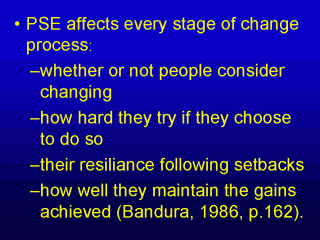 This slide shows how and where self-efficacy influences behaviour change. As you can see, it impacts at every level.