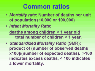 community health. The Neonatal MortalityRate (ratio) is the number of deaths in children < 1 month of age over the total number of children < 1 month. The Infant mortality Rate (ratio) is the same proportion but for children under one year of age. This is one of the best indicators of the level of health of a community. Standardization is often used to adjust for the changing structure of the population due to changing fertility, migration or war, in order that apparent changes in incidence, prevalence or mortality aren’t mistaken as actual changes in disease occurrence. Age-standardization is the most common form of standardization, with incidence, prevalence or mortality reported for given age bands, rather than the population as a whole. SMRs are used to compare mortality for different segments of the population, such as males vs. females, or people in different occupational groups vs. the workforce as a whole. If the SMR for a group exceeds 100, then that group have greater than expected mortality, and if less than 100 they have lower than expected mortality. Standardization is a general technique that can be used to adjust for the lack of homogeneity or consistency in the structure of the population. |