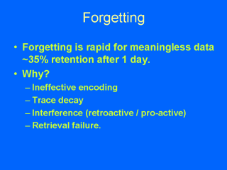 the CNS which probably is subject to micro-structural modifications over time. While we may not know much about why we forget, we know more about what kinds of things we are likely to forget. For example, I have repeatedly made the point in this lecture that the more meaning something has, the better it is retained. Conversely, meaningless data such as nonsense words are lost quickly, with only about 35% being retained longer than about 24 hours. Four main processes are known to be important in forgetting: Encoding failure: unless something is given meaning, it is difficult to connect it to the meaning map that is memory. When it cannot be located, it will be much harder to find and retrieve it. Just like when you hide one match in a match box, finding the one match is a lot easier if it is a different colour than if it is identical to all the rest of the matches in the box. Traces decay: It may be that the structural features of the memory trace are more easily lost if the information lacks meaning (e.g. is more deeply encoded) Retrieval failure: finding something once you have stored it is a common reason for poor recall. (See Encoding above) Retrieval failure can be as simple as forgetting where you put the information or more complicated. The most common reason for forgetting is inadequate encoding or even inattention at the time of encoding (see slide 4) Summary:Forgetting is common and normal. Often we “forget” because of inattention to the data, which isn’t properly encoded. |