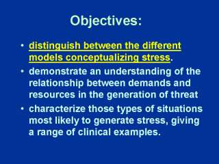 things you must remember if you are to understand “stress”. 1. Models that think of stress as a “force out there” in the environment (the stress-strain models) are called “Stimulus based” (stress considered as a kind of force or stimulus). However, if stress is a “force out there” in the environment, then all people equally exposed to this force should be equally affected (just as fire will cause charring of the skin of any person). However, people clearly are variously affected in different ways be the same situations. So such simplistic models are clearly inadequate on their own to explain what people experience. 2. Models that think of stress as only the physiological response to environmental events are called “Response based” (stress as a kind of response to the environment). However, if stress is a physiological response to environmental stimuli, then each person, on repeated exposed to this force should be consistently affected each time, in a significant dose-response manner, just like skin exposed to flame is charred on each exposure. There is no learning effect for thermal damage. Again, however, the range of experiences and the variations in peoples’ reactions suggest such models of stress are themselves also inadequate. A person clearly reacts differently to different exposures to the same situations. 3. Therefore, neither stimuli nor responses alone are sufficient to explain the range of effects people report they experience. Visit the web site above to see how confusing the idea of stress has become (this page lists four “types” of stress (survival, internal, environmental and fatigue). Are these stimulus based, response based or some other kind of stress model? That web page is confused and confusing, a common problem when “stress” is mentioned, so forget what that web page said and read on. |