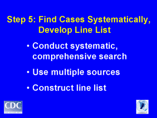 Be systematic and comprehensive in case finding. Case finding is not only to identify cases for a case-control or other analytic study, but to determine the extent of the outbreak (who is affected? are there milder cases than those that might have been the first to be reported? what is the geographic extent?)