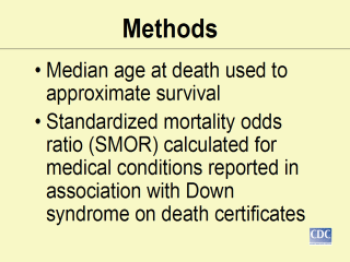 We calculated median age at death over time for people with Down syndrome by sex and race (categorized as "white," "black," or "other"). To investigate the relationship of Down syndrome-associated deaths to other medical conditions, we calculated the standardized mortality odds ratio (SMOR). |
