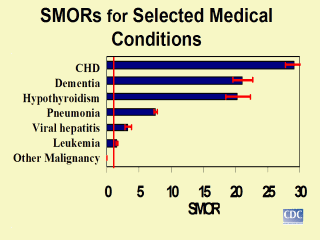 Death certificates from people with Down syndrome were 29 times more likely to report congenital heart defects, 21 times more likely to list dementia, 20 times more likely to report hypothyroidism, More than 7 times as likely to list pneumonia, 3 times as likely to list viral hepatitis, and about 1.5 times more likely to report leukemia than death certificates from people without Down syndrome. In contrast, malignant neoplasms other than leukemia, referred to here as "Other Malignancy", were listed much less often than expected on death certificates of people with Down syndrome. The SMOR was 0.07 overall. |