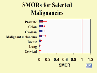 SMORs for malignancies of the prostate, colon, and ovary, malignant melanoma, breast, lung and cervical cancer were also greatly reduced.