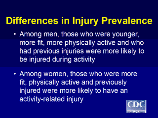 active and previously injured men. Women with the highest prevalence of activity-related injuries were more fit, active and had previous injuries. |