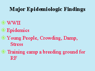 Much of our understanding of the etiology of RF has come from the brilliant work in the military. Our mothers were right when they said that we would catch the death of cold if we went out in cold, wet, nights with many people around. It is here that the agent of RF is transmitted. |