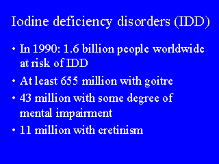 (see Hetzel, B.S. and C.S. Pandav, eds.. S.O.S. for a billion: The conquest of Iodine Deficiency Disorders. Oxford University Press, 2nd ed. 1996) The soil in many regions of the world is very poor in iodine and all food produced in this environment will likely be iodine deficient. In these areas, IDD will continue unless a new source of I is provided, either from imported food or from a supplement. |