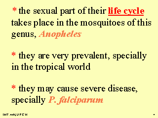 To understand a sexual cycle in the Mosquito, click the life cycle in the slide and continue "navigating" - It is fun!. Prevalence of Malaria in the World and Severity of disease is described in Malaria Foundation Fact Pack , and MalariaControl by WHO. |