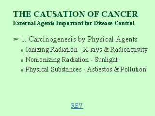 chemical and biological agents, and diet. Physical Agents: * Ionizing radiation can be background from cosmic rays and earth sources of radioactivity. More important are cumulative exposures from medical diagnostic and treatment procedures, and from commercial and occupational sources. Exposures have also occurred with warfare, as in the atomic bombs dropped on Hiroshima and Nagasaki in Japan in world war II. Leukemias and cancers of the breast, lung and thyroid are typical but cancers of the stomach, colon, bladder, and potentially any human tumor may be seen. * Nonionizing radiation of solar origin, especially the ultraviolet (UV)B wavelengths, are associated with basal and squamous skin cancers and with malignant melanoma. Certain inherited skin types (Celtic skin) are at greater risk. Commercial sources such as tanning parlors also provide risk. * Particles can also be important. The cancer risk with asbestos relates to fiber length and toughness. The risk from particles in air pollution is related to their size and propensity to settle in the lung. |