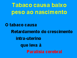 O fumo é um dos poucos fatores de risco evitáveis que tem um impacto visível nas estatísticas de mortalidade perinatal. Fumar é socialmente aceitável na maioria das sociedades. Nos EEUU, um de cada seis recém nascidos de baixo peso são devidos às mães fumantes. O baixo peso, levando à paralisia cerebral e a outros defeitos congênitos graves, é o principal efeito.
