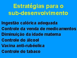 No subdesenvolvimento, uma ingestão calórica adequada, controle do fumo e da venda de medicamentos, assim como diminuição na idade reprodutiva devem ser adicionadas à relação dada para o desenvolvimento. Como as populações subdesenvolvidas tem menor controle de agressões ecológicas, os riscos ambientais para o feto são muito importantes.