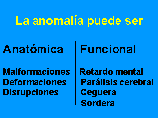 Los defectos funcionales son tan frecuentes como los anatómicos (o morfológicos). Una malformación es un error intrínseco del primordio estructural. Si alguna fuerza externa daña una estructura intrínsecamente bien formada, ocurrirá una deformación; y