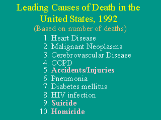 In the United States, deaths from homicides (intentional injuries) enter the picture as an important category. Homicides were the 10th leading causes of death in 1992. |