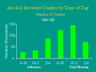 Alcohol is another major factor involved in motor vehicle crashes. In some areas, alcohol-related crashes account for one-half of all fatalities in motor vehicle accidents. Again, what is predictable regarding alcohol-involved crashes is the time of day when they are most likely to occur. We see here that the evening hours are much more dangerous from this perspective. |