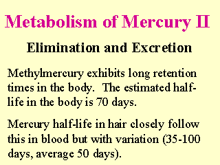 Methylmercury poisoning is like to develop if the amount of methylmercury accumulated in the body exceeds a certain least threshold crisis value. The same amount of methylmercury as is ingested is discharged from the body. There fore, even if certain amounts of methylmercury are ingested continously, the amounts of methylmercury accumulated in the body does not exceed the accumulation limit leved. |