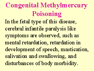 Fetal type of methylmercury poisoning is said to be far more serious than adolt type. Methylmercury poisoning in Iraq differs from Minamata in Japan. In Minamata, 22 infants with serious cerebral disorder were form of mothers who showed slight or no symptoms whatsoever, whereas in the incident in Iraq, there was only one case (among 25 mother-infant pairs) in which a mother showed no symptoms although her child did. |