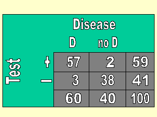 但是如果你只利用這一檢驗在有這一疾病的症狀的老年人以確定其診斷時,你就會得到如左表的結果。 也就是接受檢驗的 100 個人中,真正有病的人為 60 個人,而當此一檢驗的敏感度與特異度皆為 95% 時,你所得到的陽性預測值為 97%(57/59),而陰性預測值則為 93%(38/41)。這表示此一檢驗真的很管用。 |