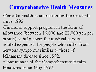 In the event of the end of suits and conflicts, the government and the prefectures concerned decided to continue the financial support to the program of the Comprehensive Measures of Minamata disease. |