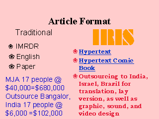 The power of the Internet is that there are multiple exciting ways to which the research communication can be presented. Of enormous importance is that for the first time the raw data can be easily retrieved. Outsourcing could produce major cost savings, for example, the Medical Journal of Australia has 26,000 subscribers. It takes 17 people to publish the paper version. If the average wage was $40,000 this would represent $680,000. If most of the work were outsourced to India, the costs might be $6,000 per person, for a total cost of $102,000.