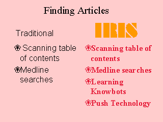 Articles could be found with both either by scanning or by Medline or other search engines. The IRIS, would also use learning knowbots to scour the Internet for information you want. Push technology would put it on your PC.