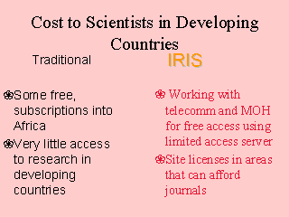 Access to research communications in developing countries is almost none existent. A medical library in the US will have 3,000 subscriptions. In many medical libraries in Africa they have not received a scientific journal in a decade. With the Internet, scientific journals could be provided for free via a limited access server, such that only Kenya would received Science. This costs Science essentially nothing, and they are not compromising their subscription base by making the journal open to the world.