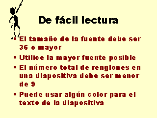 web. Utilice por favor la mayor fuente posible en la diapositiva ya que esto mejorará la facilidad de leer la diapositiva en el web. Para enfatizar palabras claves, puede que desee utilizar un color diferente al del texto normal de la diapositiva. Esto mejorará también la facilidad de lectura. |