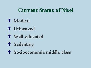 Today, the Nisei are very different from their Issei parents. They are more modern, urbanized, well- educated, sedentary, and with higher socioeconomic status. The change in their status may be associated with lifestyle change that are related to the etiology of type 2 diabetes in this population. |