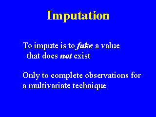 If the non response is small, sometimes it is convenient to impute a number for the missing responses. This 'fabrication of data' is permissible if the only reason for it is the performance of some multivariate technique which requires complete sample. Obviously it can not be used to reduce the error of the estimators. |