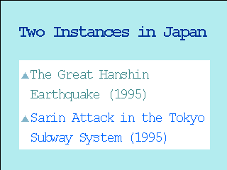Japan experienced two major disasters in 1995; the Great Hanshin Earthquake and the Sarin Attack in Tokyo subway system. These two events revealed that Japan did not have well-organized systems for disaster management. Of all the problems experienced in the events, one of the most serious ones was lack of appropriate means to collect and provide information to and from the midst of the disaster. |