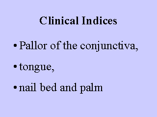 iron delivery to the hematopoietic tissues. Serum Transferrin receptors: Serum transferrin receptors reflect the number of receptors in immature red blood cells and thus the level of erythropoiesis. It is unaffected by infection or inflammation what makes Serum Transferrin receptors concentration be an accurate index of Iron nutrition status. Erythrocyte protoporphyrin: protoporphyrin combines with iron to form heme. Under ID conditions, the lack of iron determines an increase in erythrocyte protoporphyrin, which can not combined with Iron. Increased values of erythrocyte protoporphyrin indicate impaired erythropoyesis due to iron deficiency. Values greater than 100 ug/dl and 120 ug/dl have been used as cutoff points Pallor of the conjunctiva, tongue, nail bed and palm can be used as clinical indices of ID what is due to the low hemoglobin concentration in areas with high vascularization. Even when they are easily and inexpensively obtained, subjectivity is the main problem of clinical indicators. |