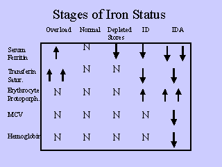 approach, as shown in the table, we can identify. Iron sufficient status: where biochemical tests present normal values. Iron depleted non-anemic: when iron stores (Serum Ferritin) are depleted but hemoglobin values are not affected. Iron deficient erithropoyesis: where a higher depletion is observed with erithropoyesis affected , but still normal hemoglobin values. Iron deficiency anemia: stage that represents the end point of a continuum iron depletion where hemoglobin has been affected. As it was mentioned, the final confirmation of these stages requires an examination of the response to iron supplementation. |