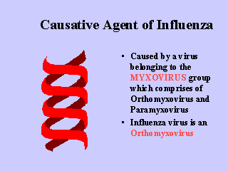 Influenza virus is a Myxovirus belonging to the family Orthomyxoviridae. There are three types of influenza virus, A, B, and C. Parainfluenza viruses, mumps, measles and respiratory syncytial virus are members of the Paramyxovirus family. All these viruses cause respiratory symptoms as part of their clinical picture. |