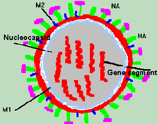 Hemagglutinin is shown as spikes and neuraminidase as rods. Influenza virus has ten different proteins, two of which are HA and NA. The biochemical characteristics of these two proteins (glycoproteins) determine the different serotypes of influenza A virus. M1 and M2 are matrix proteins. Types A, B, and C are determined by the nucleoproteins. |