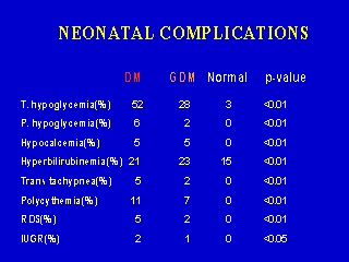Neonatal complications were significantly more frequent in both the offspring of DM as well as that of the GDM mothers; when compared to the normal glucose tolerance mother. Moreover, these complications were even greater in the offspring of DM mothers than that of GDM mother. This phenomena might suggest neonatal sensitivity to the mother glucose metabolism during the pregnancy. |