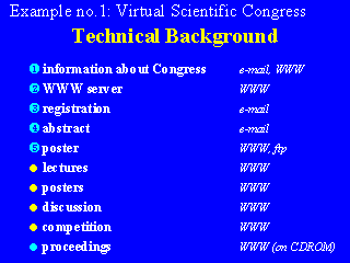 be opened. Firstly the information about a congress was sent via e-mail to the medical electronic conferences and to the medical Internet clubs. Secondly the WWW server was built up. Thirdly each participant sent the registration via e-mail to the e-mail address of the Congress secretariat. Fourthly the abstracts of posters were sent via e-mail to the organizing committee. After the confirmation of committee each of the active participants prepared the poster in the html code which is used by WWW service. Each participant obtained the user account on the Web server and moved the poster into this server via ftp service. Then the Congress could be opened. Participants used WWW service both for browsing lecture or/and posters and for discussion. Several weeks later all active participants and members of INABIS received the CDROM with proceedings.