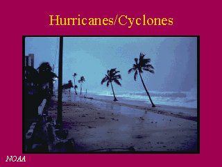 | The next series of slides will examine the risks and effects associated with specific hazards. For each of the following categories of disasters, I will discuss the primary health effects associated with them, known information on risk factors for the hazard, and mitigation strategies to reduce their impact. I begin with a discussion of hurricanes and cyclones. |